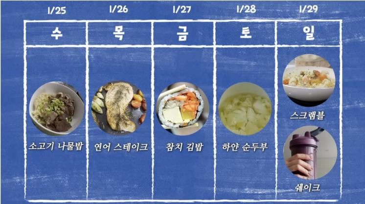 - 7일차 : 아침 - 바나나, 점심 - 닭가슴살, 저녁 - 브로콜리와 두부